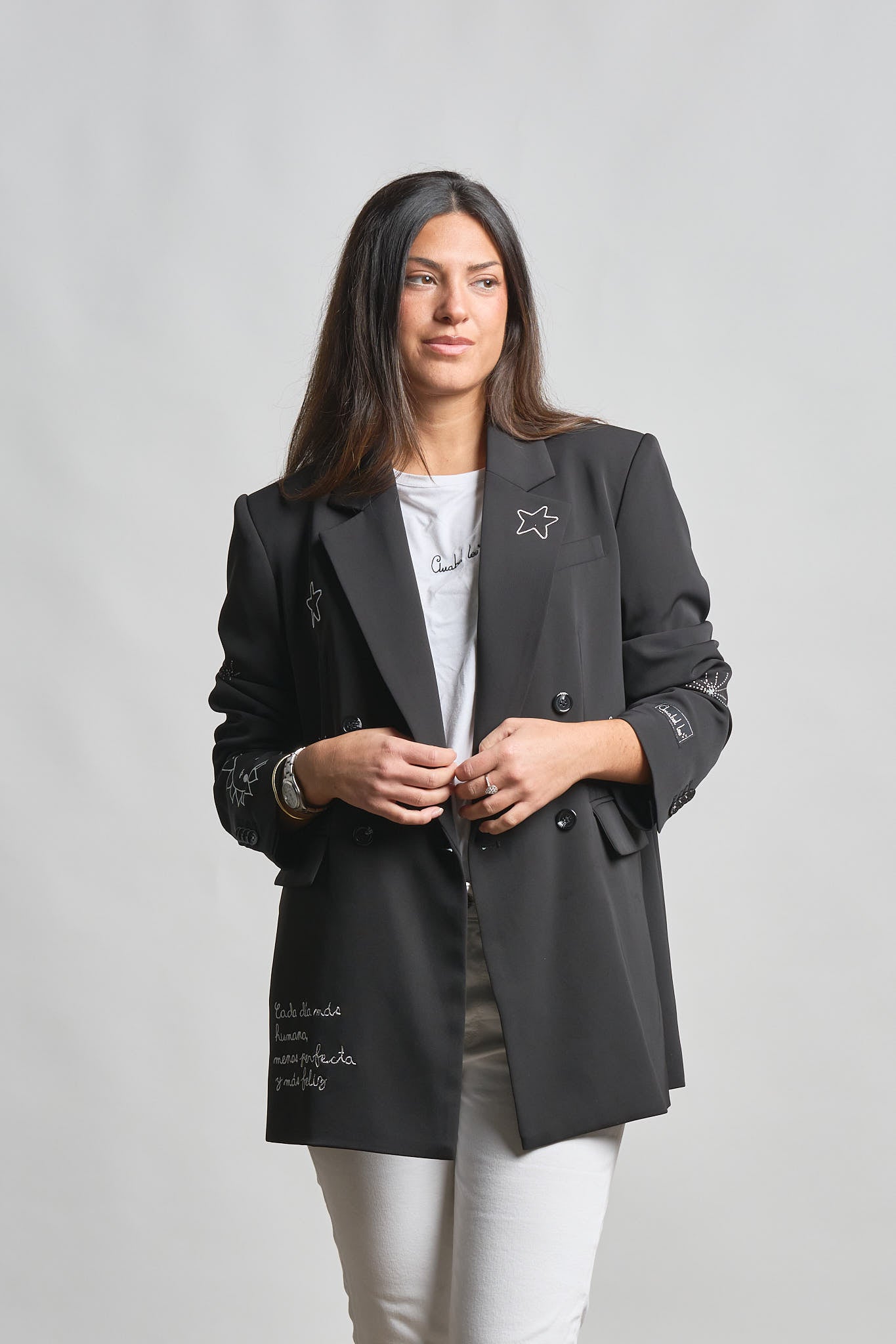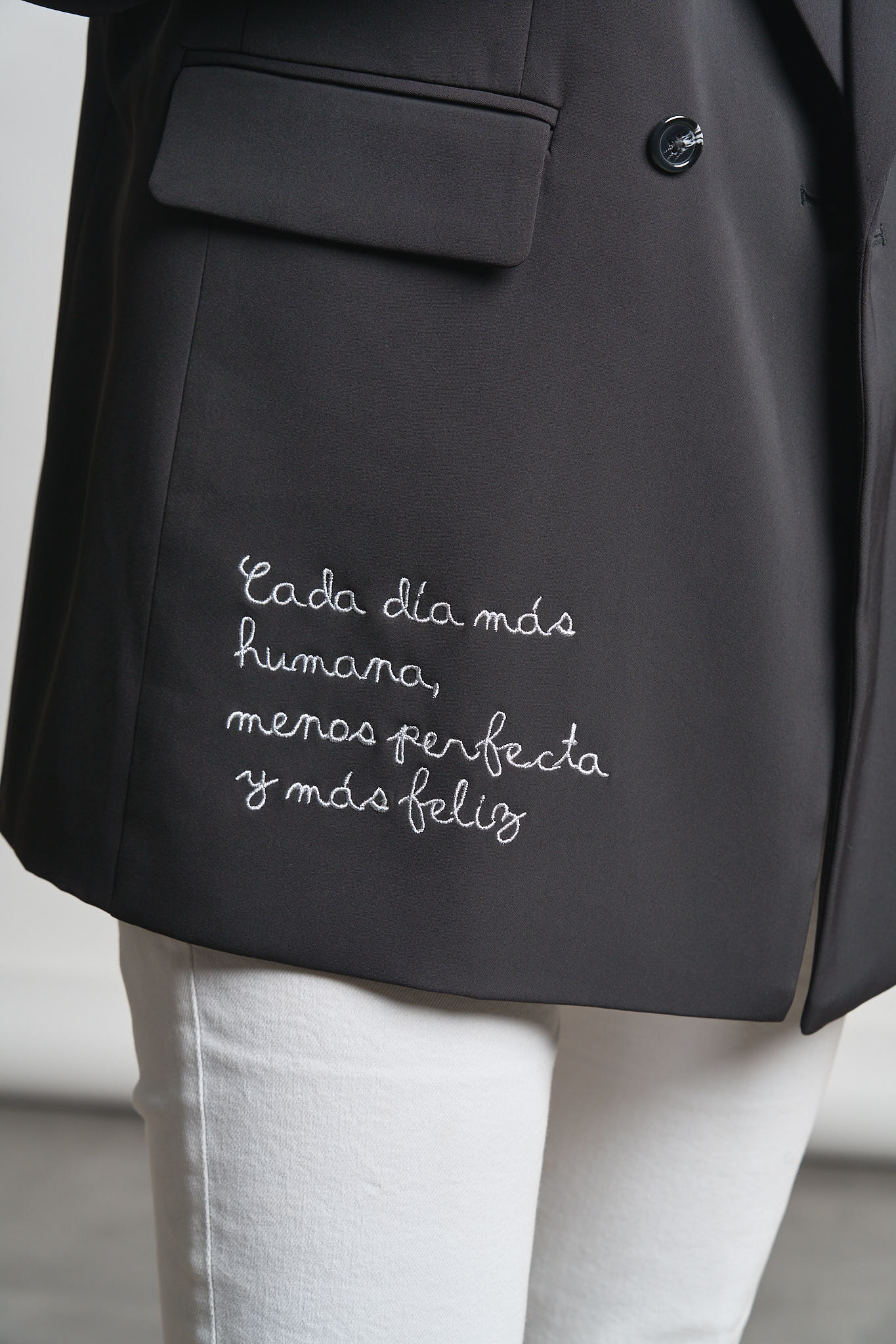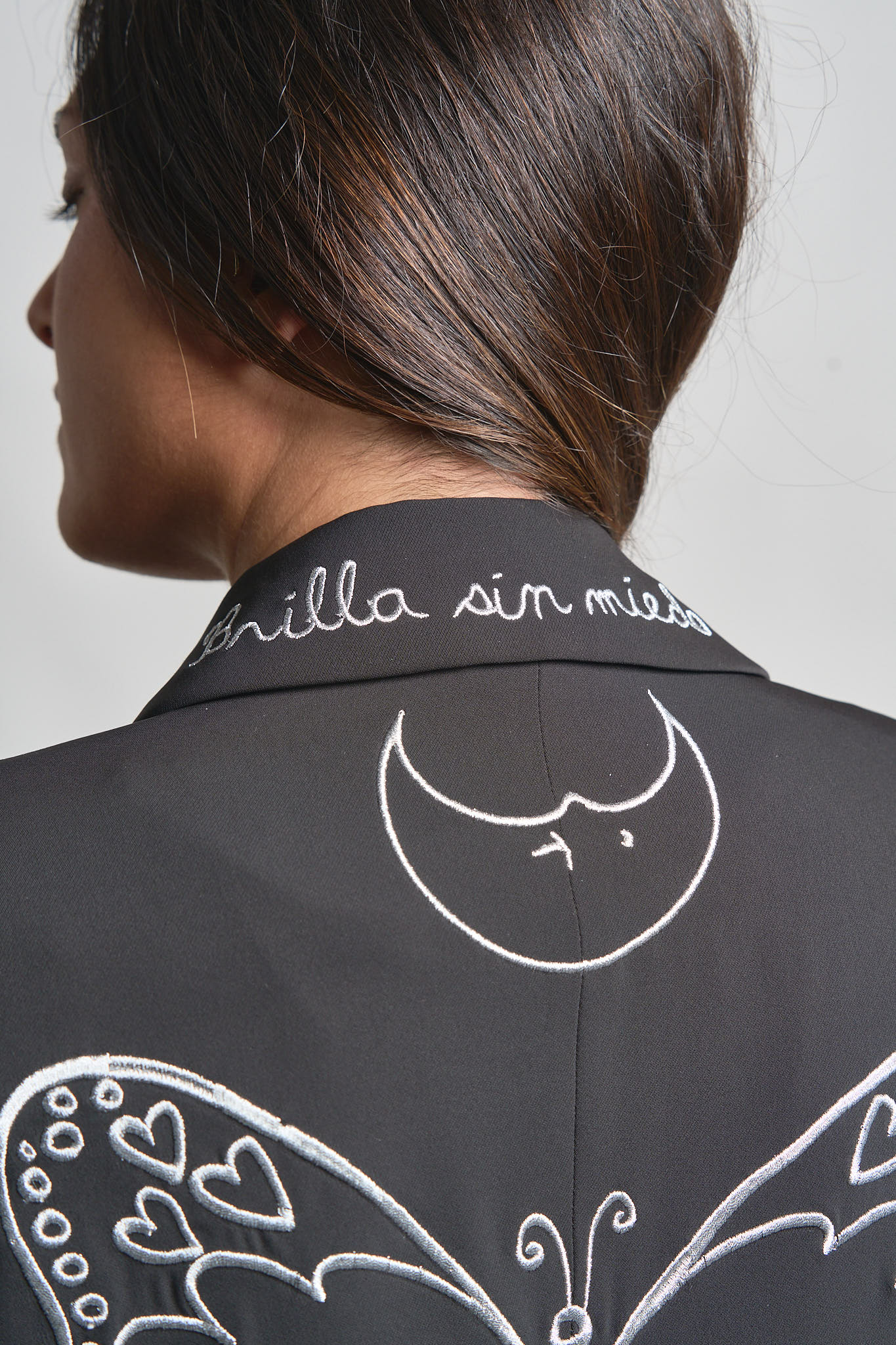 -Ilustración bordada en parte trasera y detalles estampados sobre la blazer.