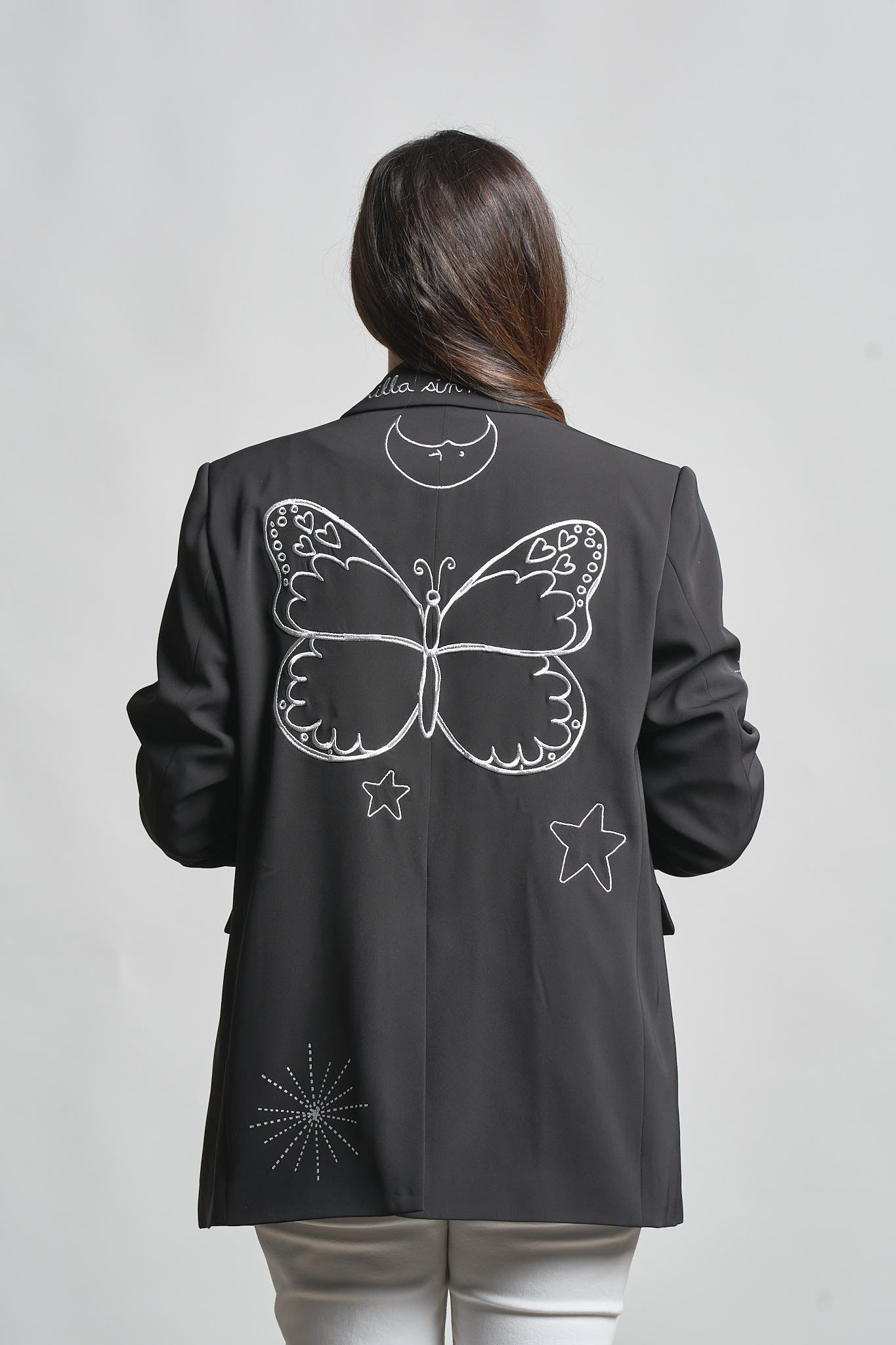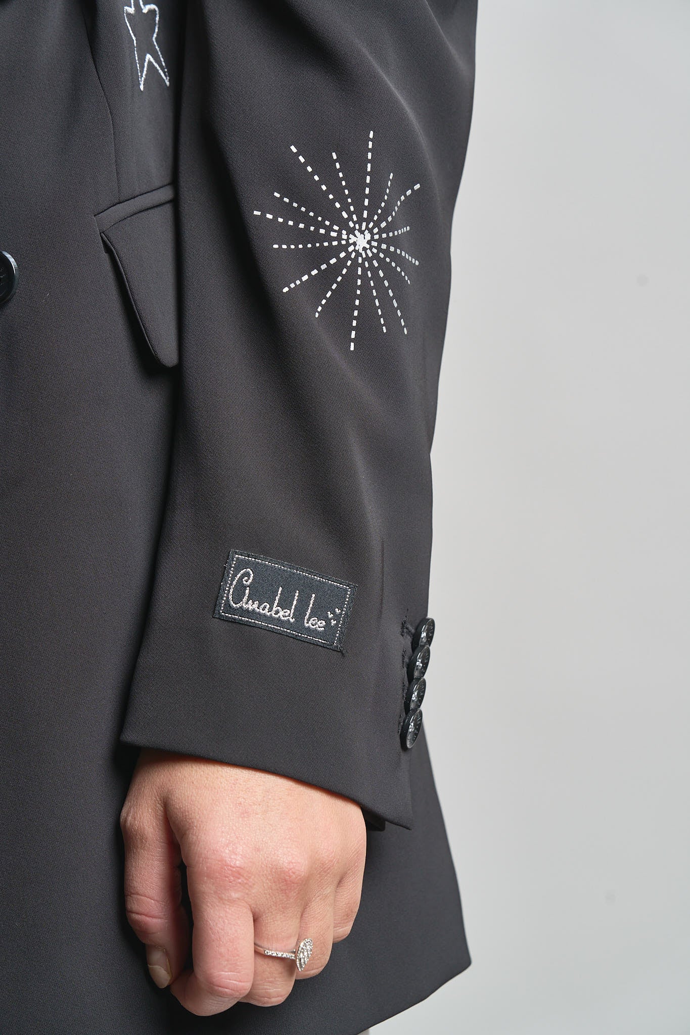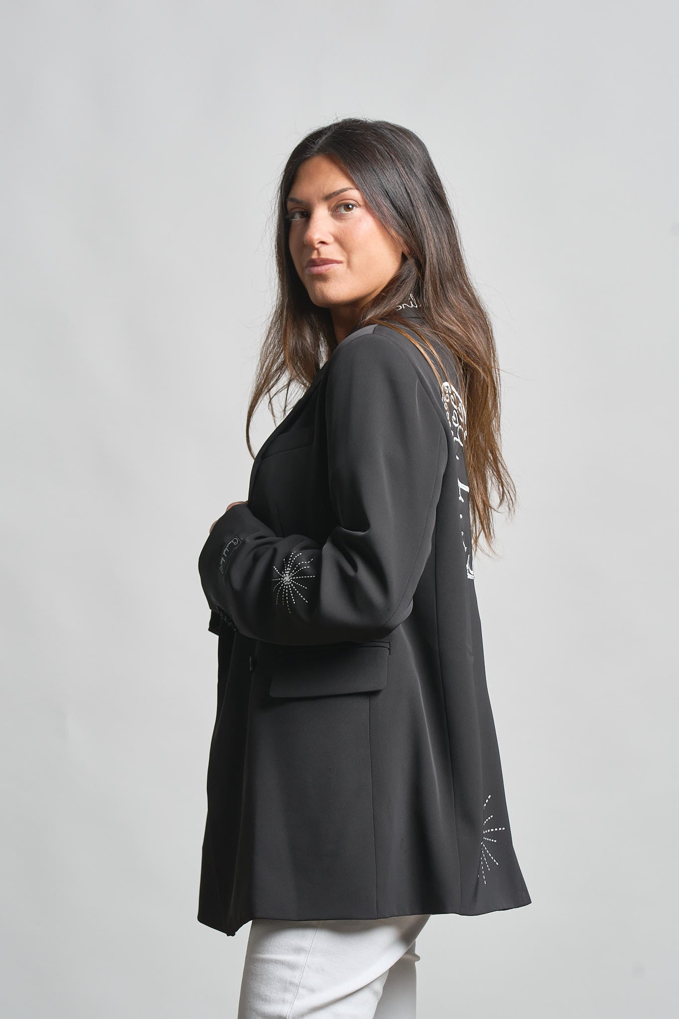 -Ilustración bordada en parte trasera y detalles estampados sobre la blazer.