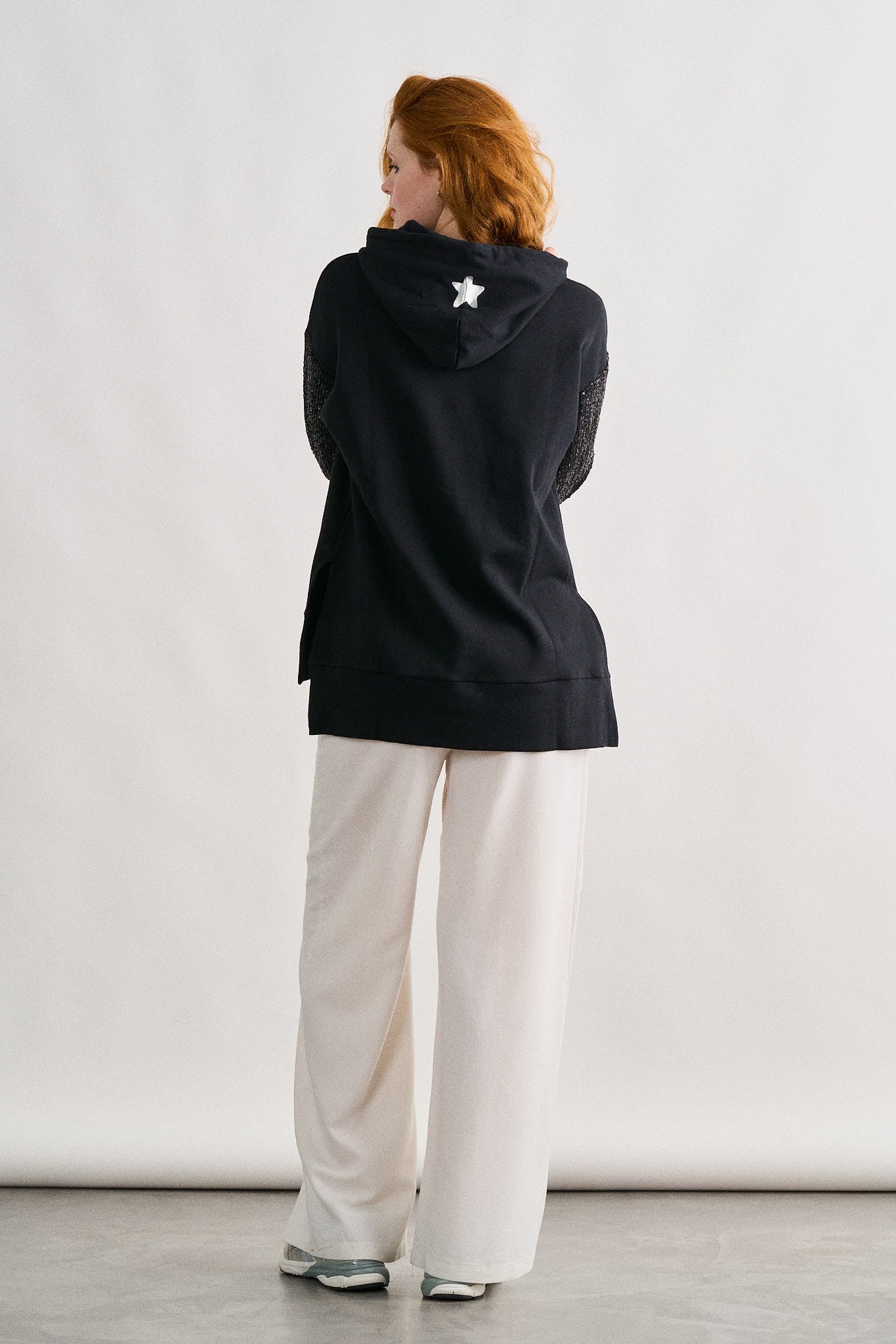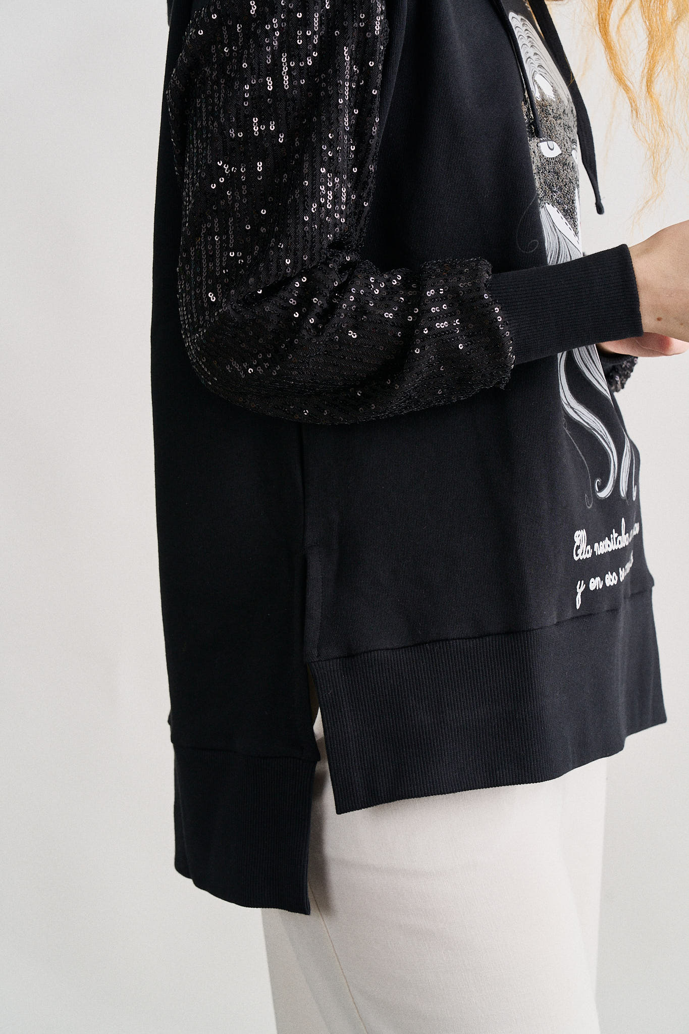 -Sudadera felpada, con aberturas laterales y largos desiguales.