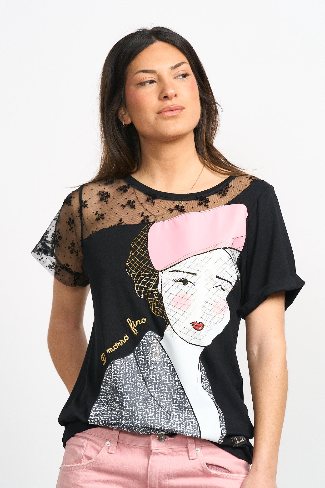 -Maxi print delantero con foil y frase bordada en lurex dorado.