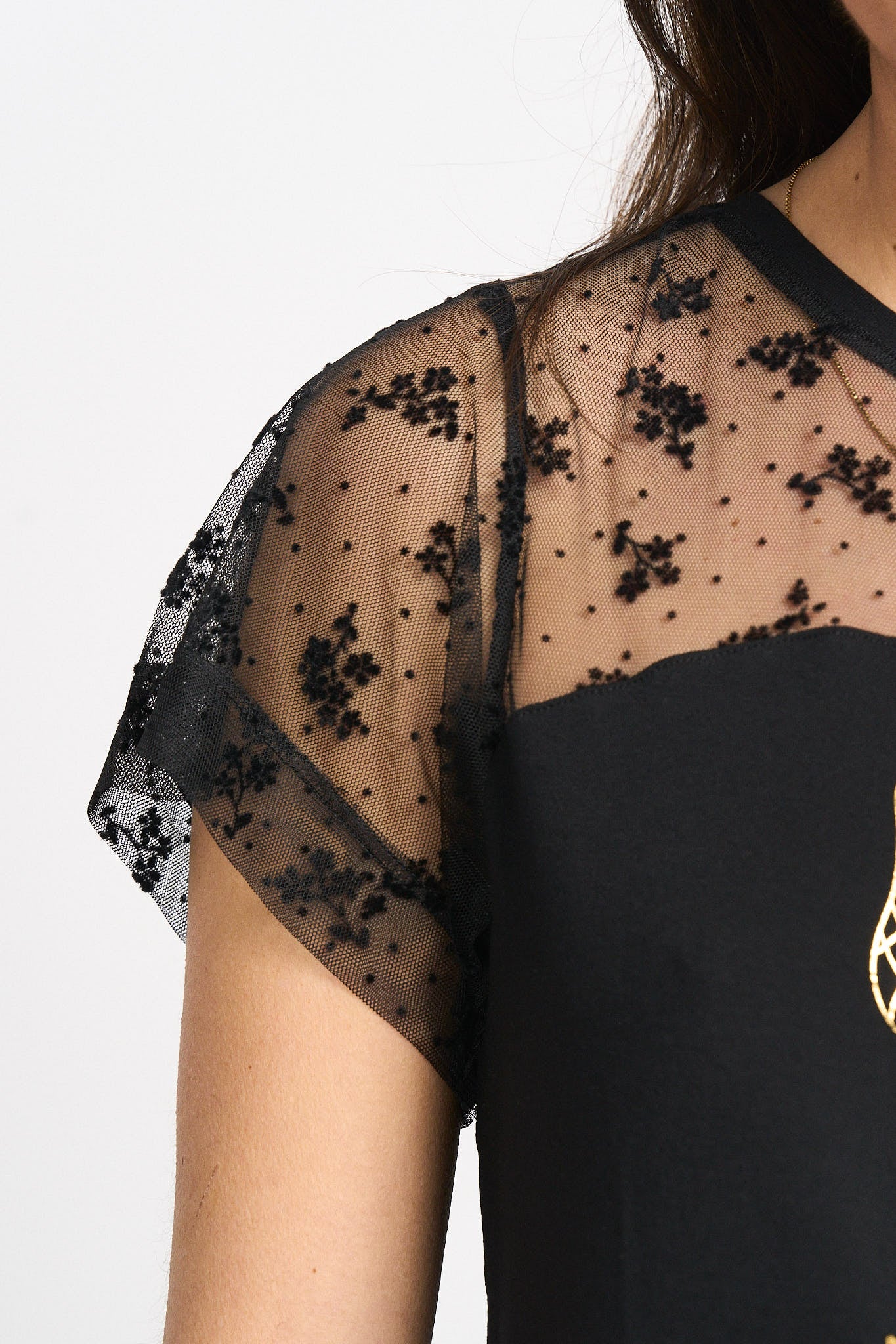 -Detalle de puntilla con relieve de foco, en manga y hombro derecho.