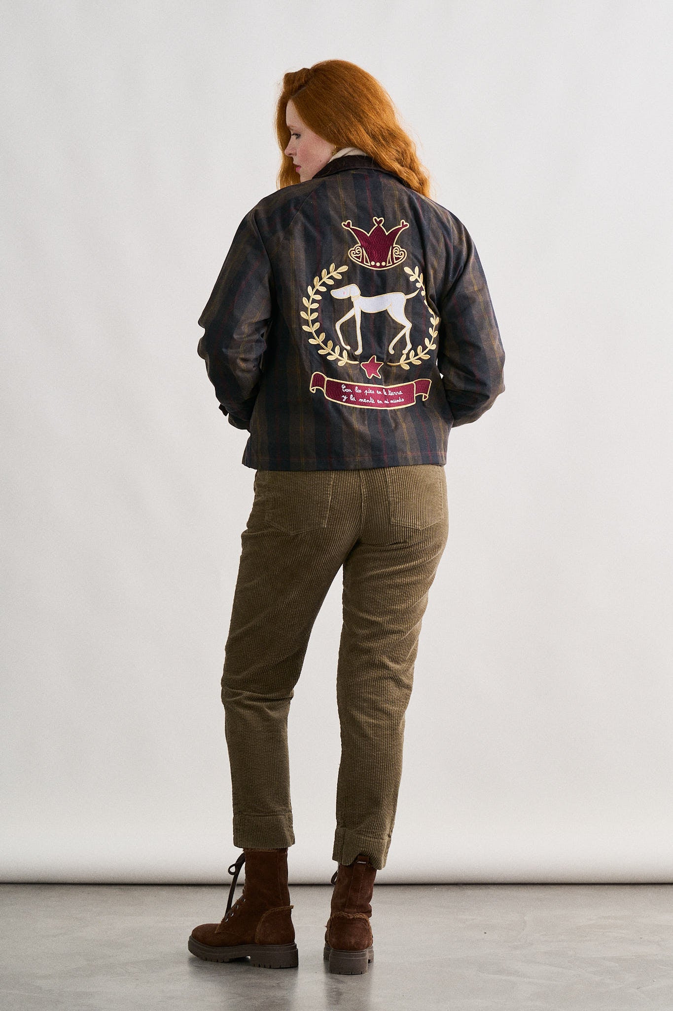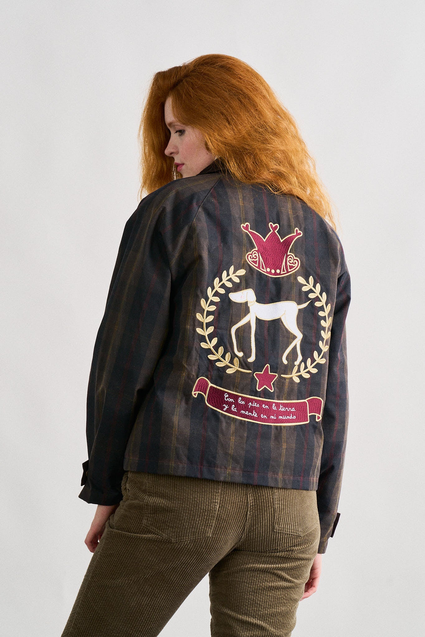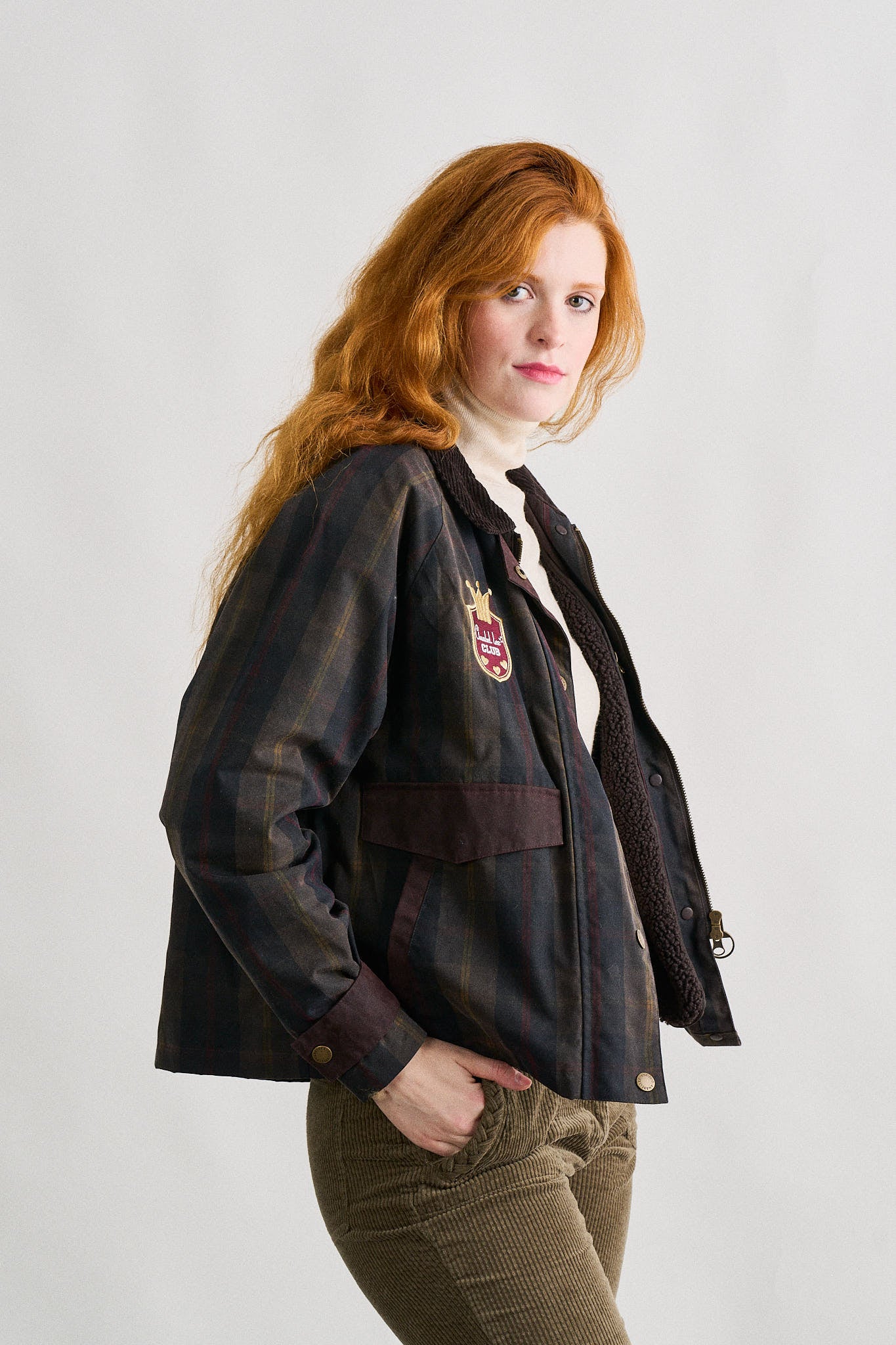 -Chaqueta encerada corta de cuadros tartán en tonos oscuros, de corte recto.