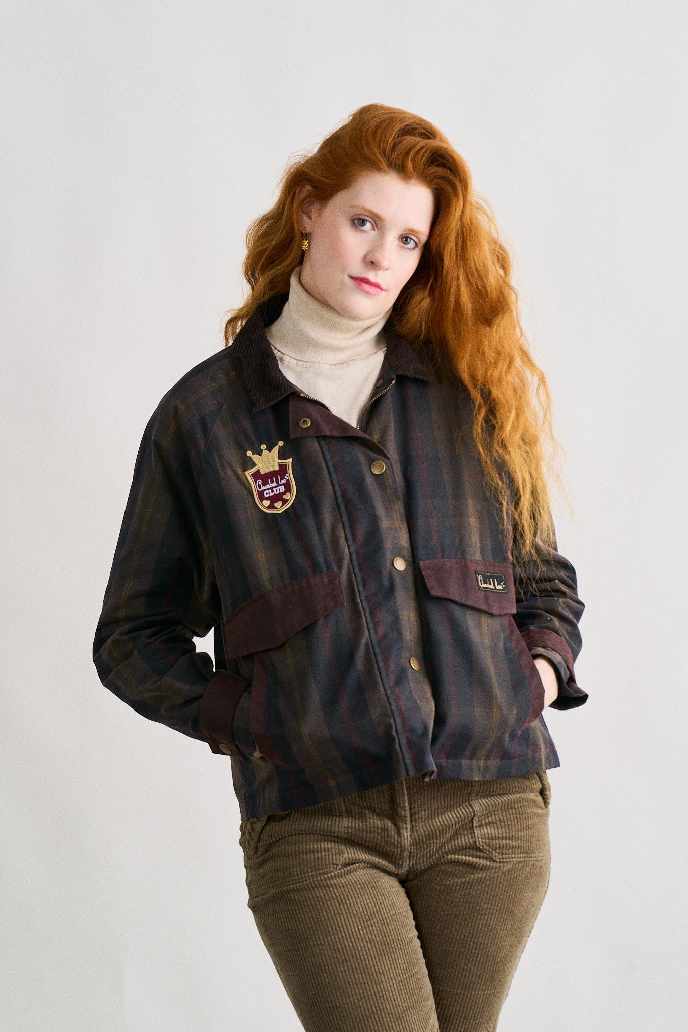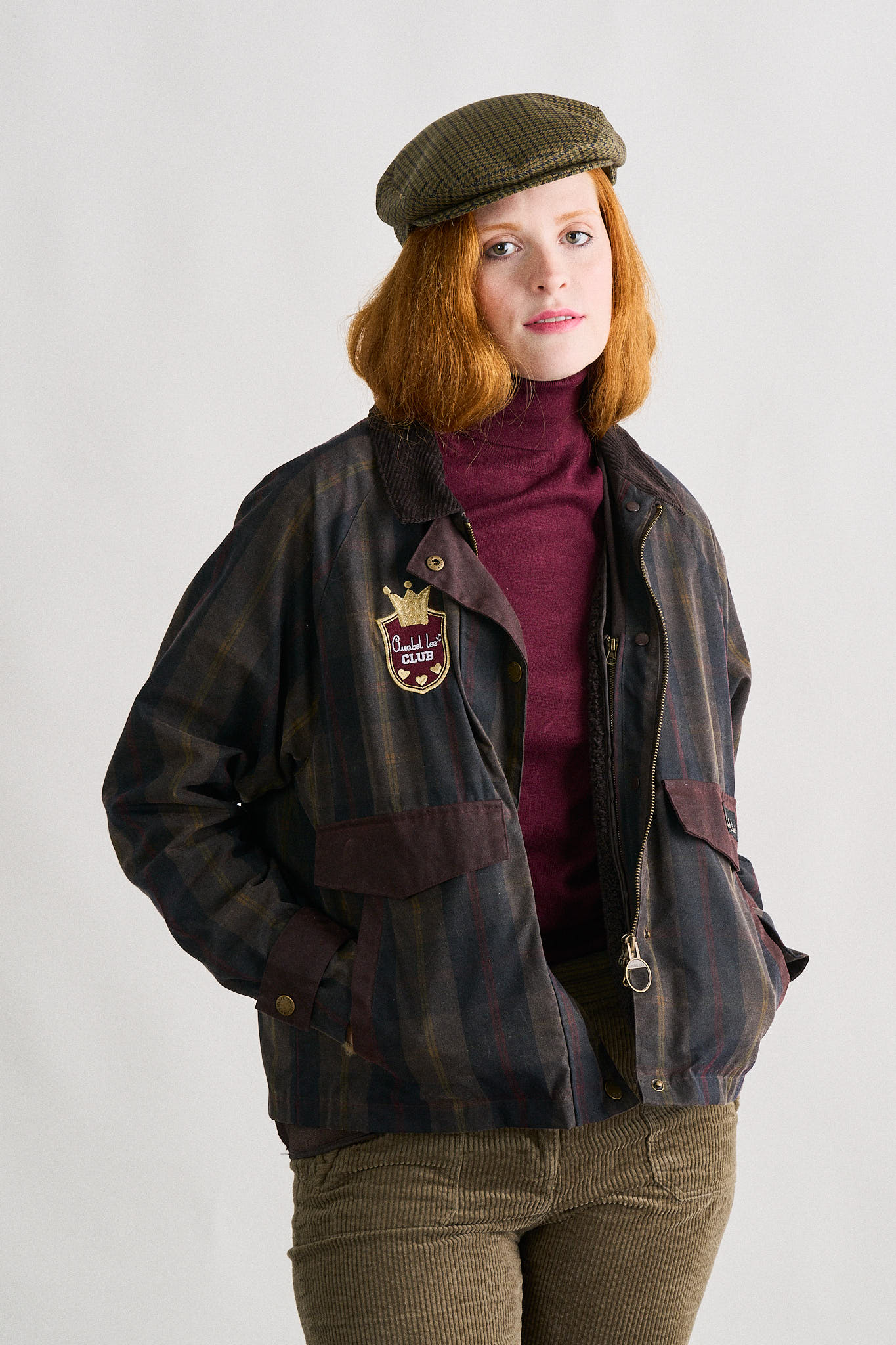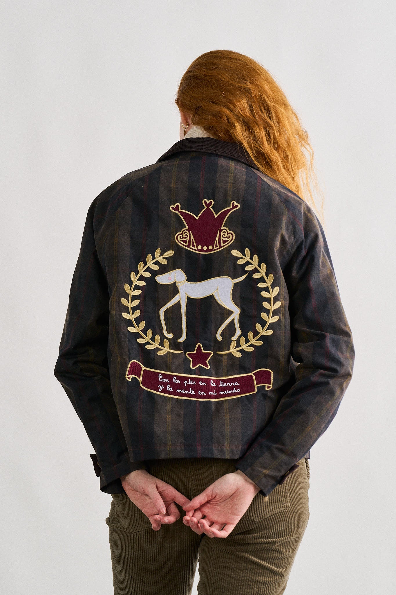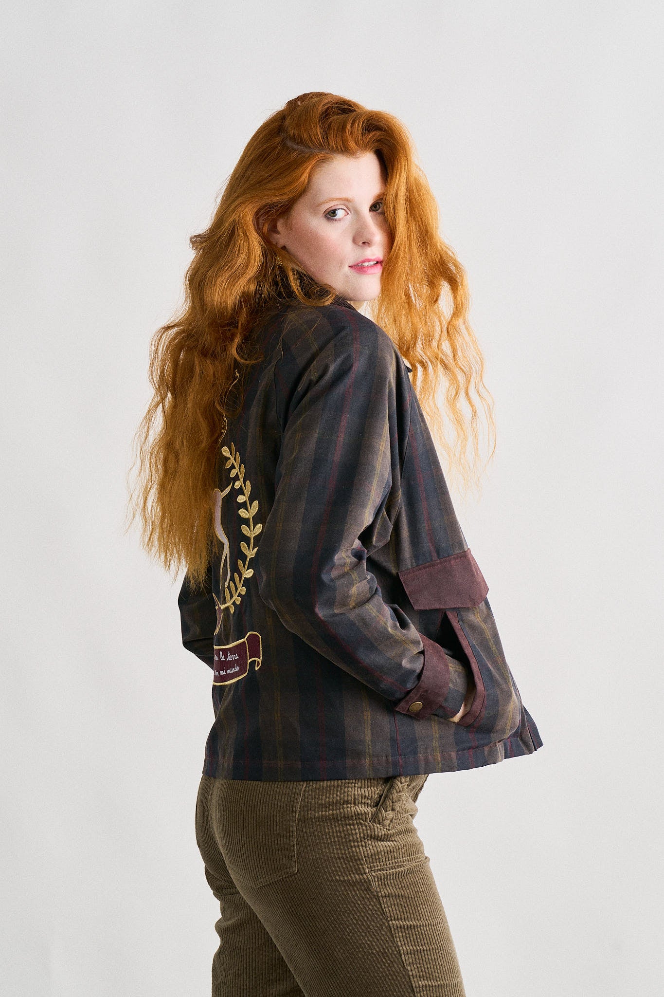 -Chaqueta encerada corta de cuadros tartán en tonos oscuros, de corte recto.