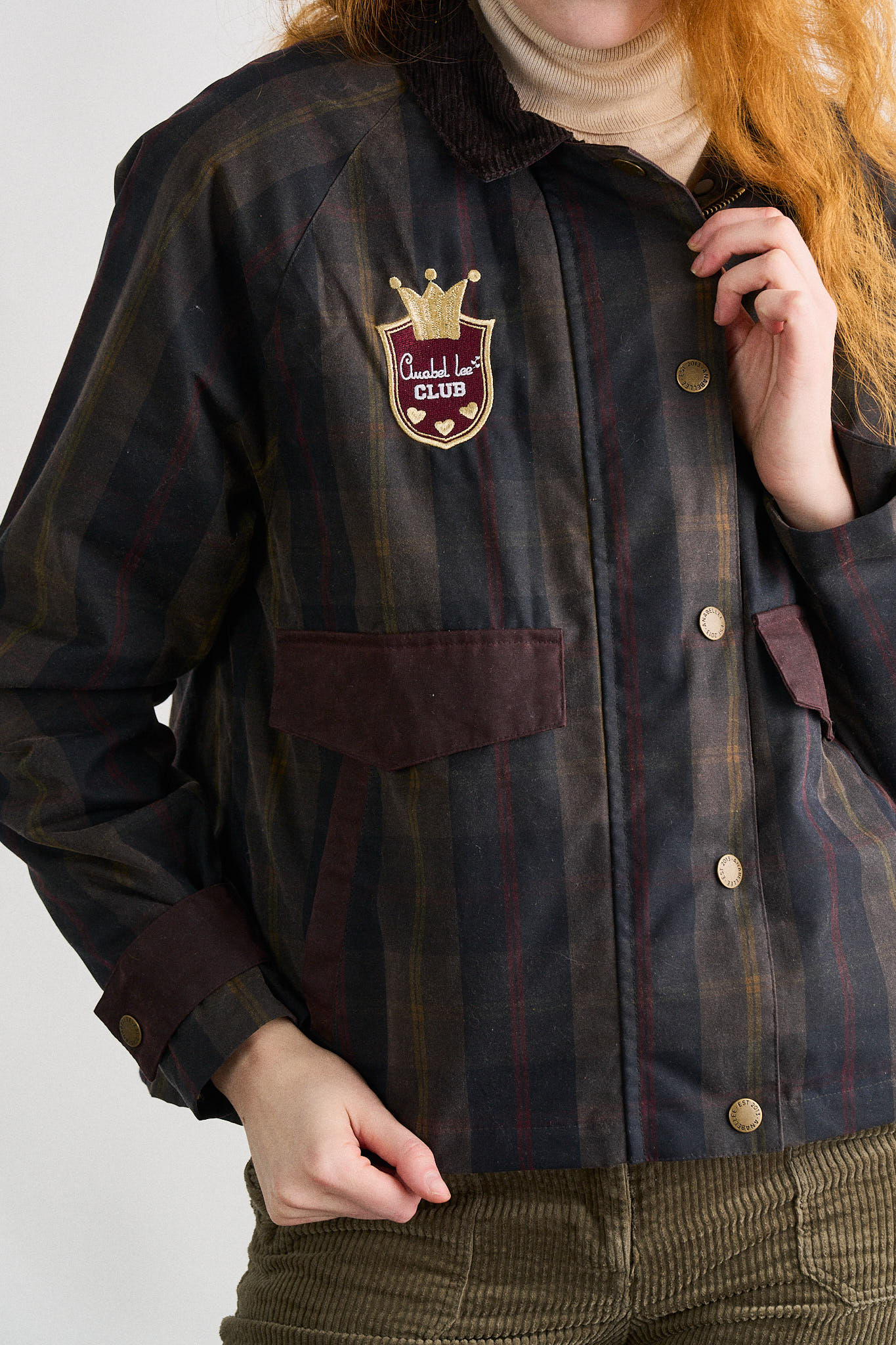 -Detalle de etiqueta exterior con logo en bolsillo, y botones y cremallera personalizados con logo Anabel Lee.