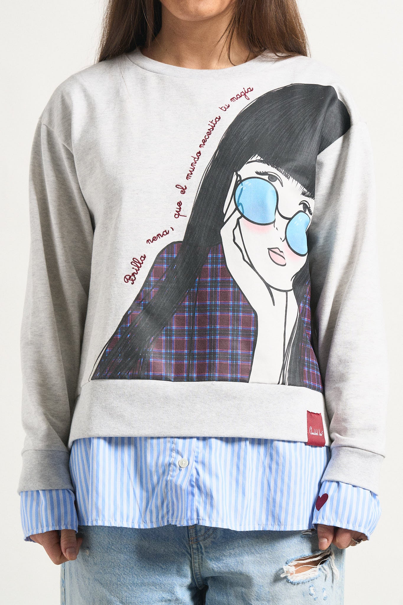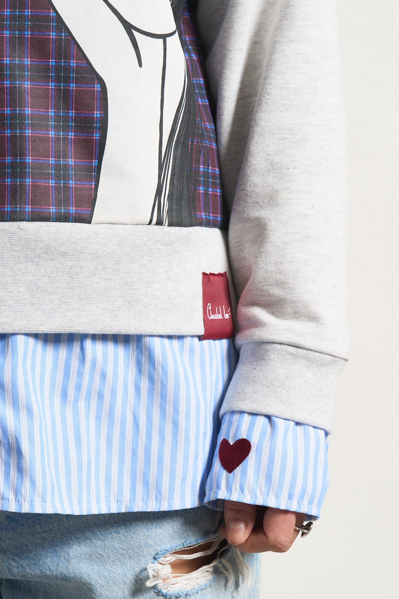-Puño de camisa popelín interior adherida a la sudadera, con detalle de corazones bordados.