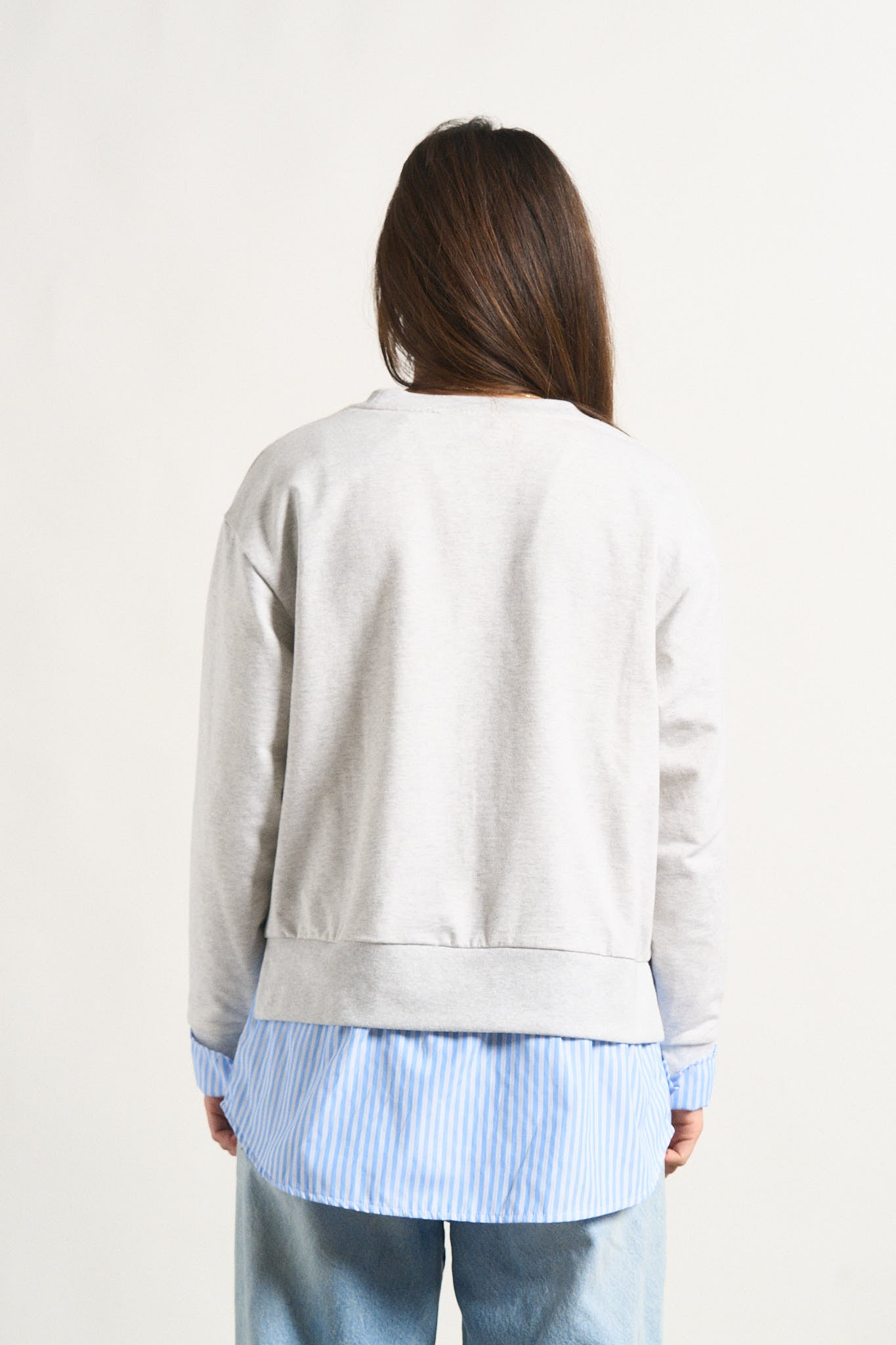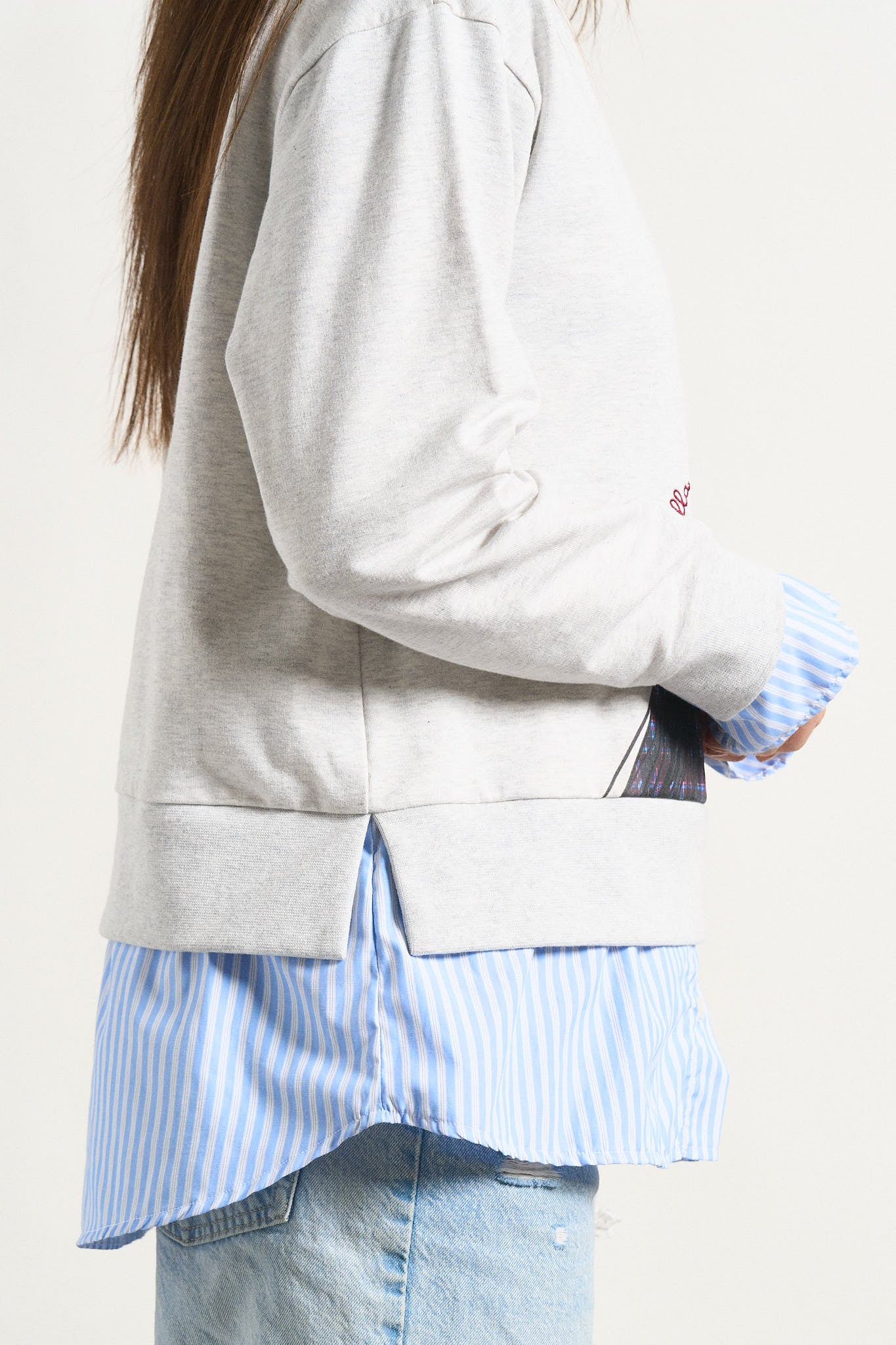 -Bajo de camisa popelín interior adherida en el cuerpo de la sudadera, con largos desiguales.