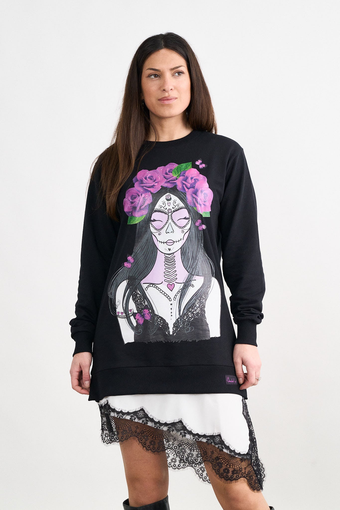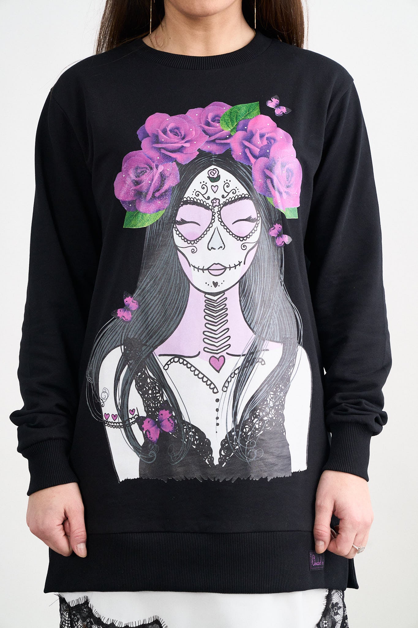 -Maxi print delantero con glitter y cristalitos.